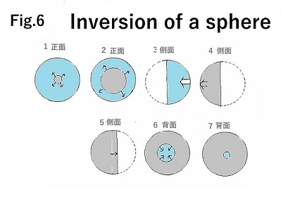 As a third example, let's consider the case of "I am thinking." In this case, unlike the first two cases, advanced functions are involved. For instance, imagine a spherical object made of stretchable rubber with a hole opened on it, and the scene when you flip it inside out. You might visualize the image of the sphere in your mind and think that you can widen that hole and flip it around. You might think, “It's a simple thing.” However, when it comes to expressing it in a way that is understandable, as shown in figure 6, it turns out to be difficult.