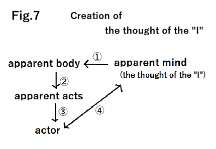 Who is performing the “apparent act” of "looking at"? It can be said that the one responsible for creating that thought is the “actor”. In other words, based on the “apparent acts”, the thought of “actor” performing that act arises, which leads to the creation of the “thought of the 'I'” as a result. From another perspective, it can be said that the thought of the “actor” is created through the “apparent acts” via the “thought of the 'I'”. If it is shown in a diagram, the “actor" arises as an existence performing those acts, and as a result, this leads to the creation of the “thought of the ‘I’”.